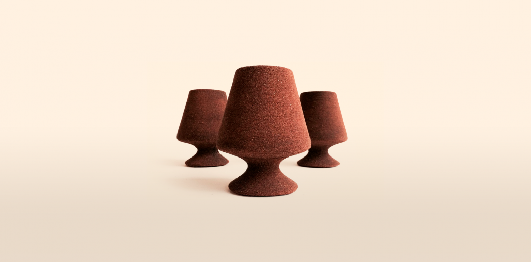 Rael created these goblets as one demonstration of how wine industry waste (in this case, discarded grapes) can be repurposed into useful items. There is a surprising amount of waste generated by the winemaking process – for perspective, California wineries alone generate over 100,000 tons of solid remains from crushed grapes.