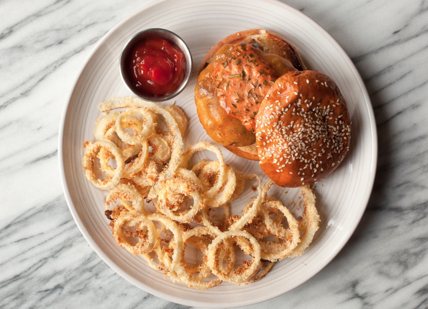 Wipe pan from burgers clean and place over medium heat. Place buns cut-side down in pan and cook until toasted, about 2 minutes. Spread dressing on top and bottom of buns, then add burgers and top buns. Serve with onion rings alongside.