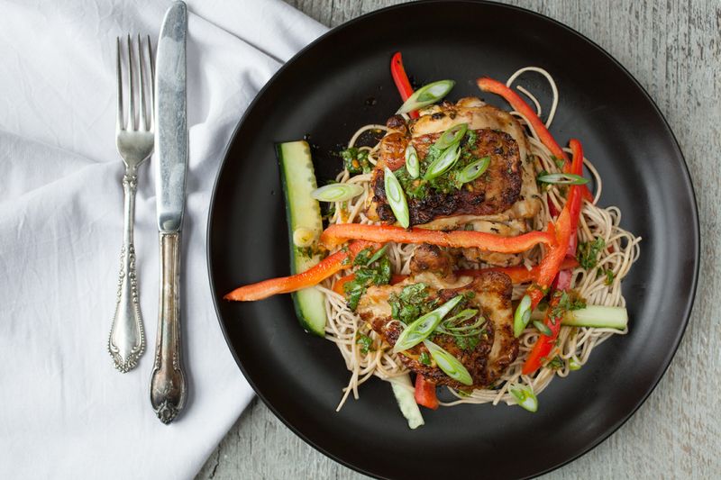6. Plate Chicken – In a large bowl, combine soba noodles, bell pepper, cucumber, half of scallions, rice wine vinegar, and sesame oil. Toss to combine. Taste and add salt and pepper as needed. Divide between 2 with chicken. Garnish with reserved marinade and scallions. Serve.