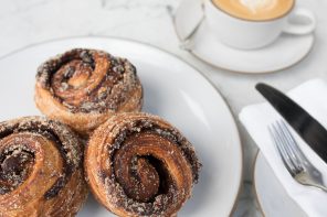 SPREAD a thick layer of cinnamon and sugar out on your workspace. Using a pastry brush, cover the dough in the egg wash then roll it through the cinnamon sugar until well coated.