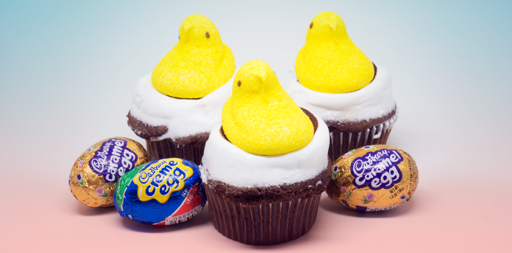 Easter. The holiday means many things to many people, but with an estimated $2 billion spent every year on 90 million chocolate bunnies and 16 billion jelly beans, it is safe to say that the best part for everyone is the candy. This year, we’re taking things to the next level with two Easter candy classics – marshmallow Peeps! Cadbury Creme Eggs! – and putting them in the only thing we love just as much as discovering a hidden Easter egg: Cupcakes! With a hidden egg inside and little yellow chick on top you’ll have the cutest bird’s nest around.