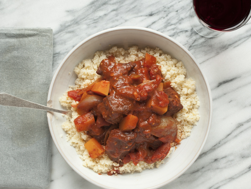 Taste tagine and add salt and pepper as needed. Divide couscous evenly between 2 bowls and spoon over tagine. Serve hot.