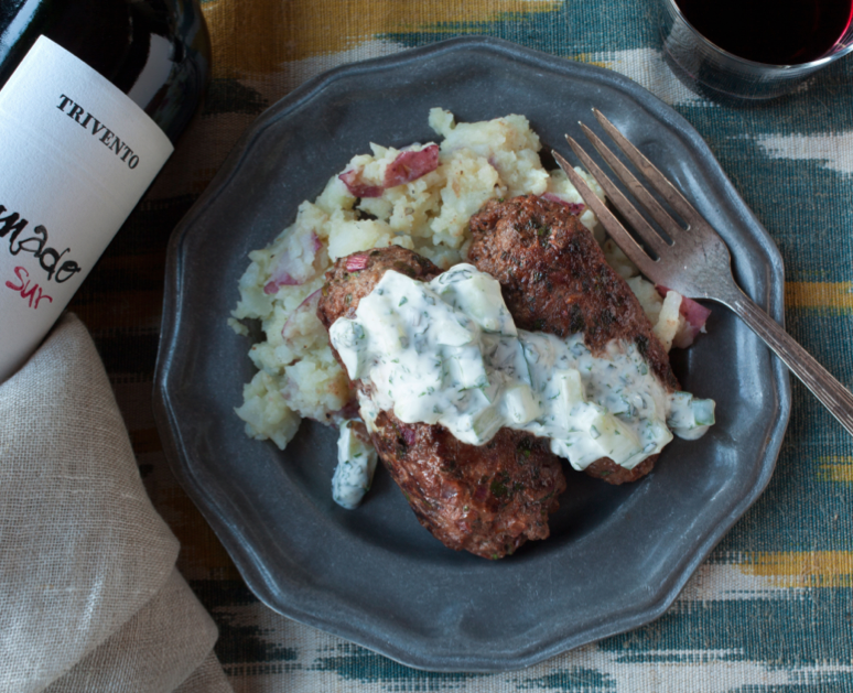 Divide smashed potatoes evenly between 2 plates. Place lamb on top and spoon over raita. Serve