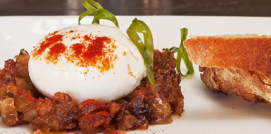 POACH eggs gently in simmering water with a splash of white vinegar, when jam is ready. Meanwhile, toast ciabatta bread and top with paper-thin slices of lardo. Serve the egg on a bed of the jam with the lardo toast on the side. Add a touch of paprika to the egg and top with a slice or two of scallion. Serve immediately.