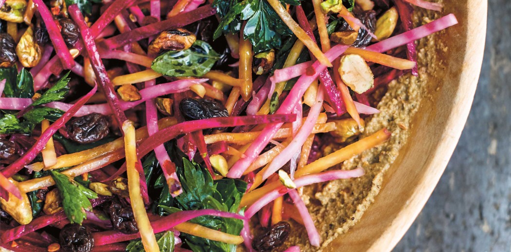 SPREAD a layer of pistachio butter onto each plate and top with the slaw.