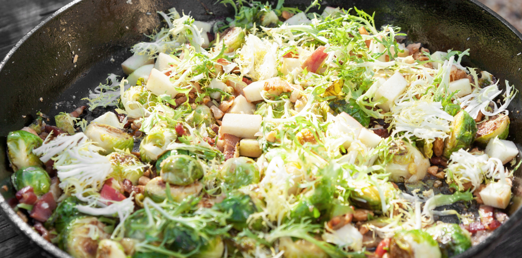 ADD the frisée, apples, almonds and extra-virgin olive oil and toss. Season to taste with salt and pepper. Plate or eat right out of the pan.