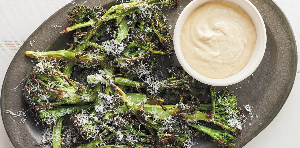 SPREAD all the broccoli on a rimmed baking sheet and broil—with no oil—until it is slightly softened and nicely charred on most surfaces, turning once, 5 to 7 minutes. You can also do this on a grill, but you’ll need a grill basket.