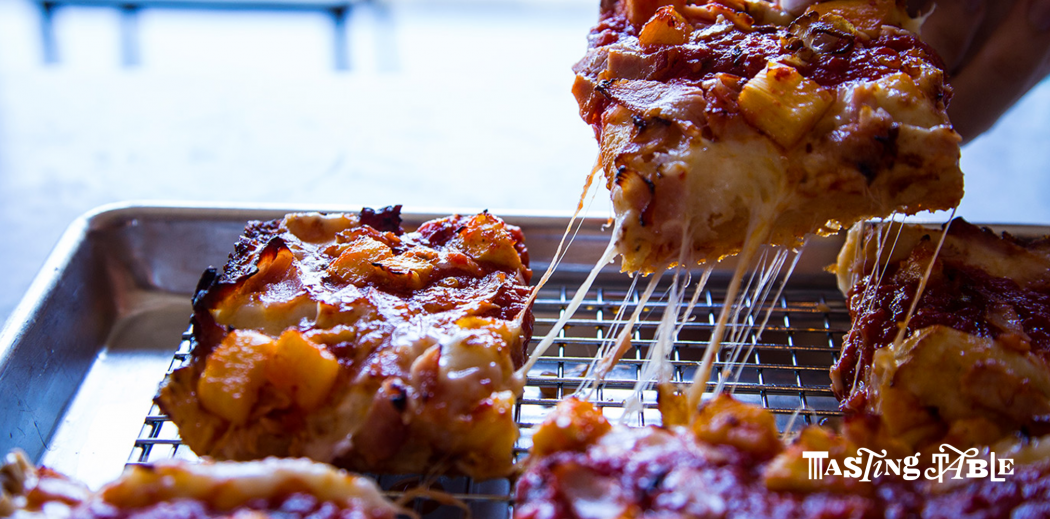 ASSEMBLE the pizza by laying down the cheese over the dough, starting from the perimeter and working your way into the center. Spread two strips of marinara sauce lengthwise along the pizza. Top with pieces of torn ham and then chunks of the marinated pineapple.