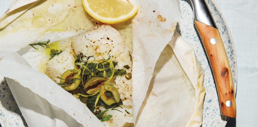 Place the sealed packets on a baking sheet and bake for 10 to 15 minutes, depending on the thickness of the fish. The packets will be slightly browned and puffed up. To serve, place each packet on a plate and make sure each guest has a sharp knife to cut his or her packet open.