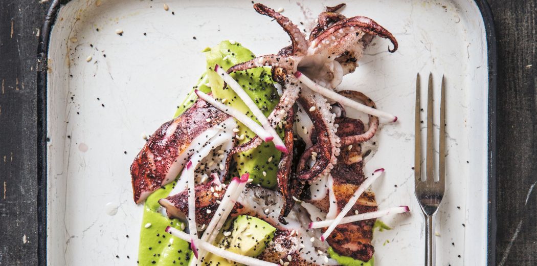 Smear the dressing onto a large platter and top with the grilled squid. Arrange the pieces of avocado alongside. Drizzle with a ribbon of olive oil, garnish with radishes and a sprinkle of poppy seeds, and season with salt. Serve immediately.