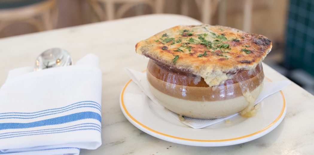 FILL a serving dish ¾ the way up to the rim with boiling onion soup, top with ½ cup of the croutons in each.