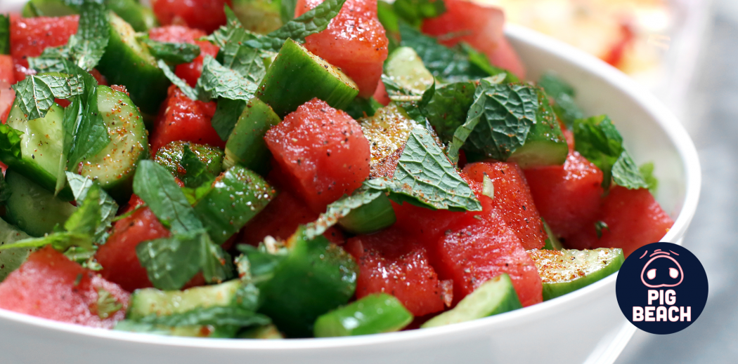 POUR the vinaigrette over the Persian cucumbers and watermelon.
