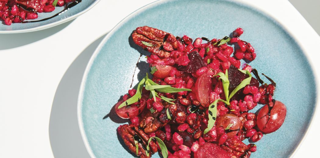 Reserve some pecans and tarragon for garnishing. Mix in the remaining beets, cranberries, grapes, pecans, and tarragon. Taste for seasoning and add more salt and pepper if necessary.