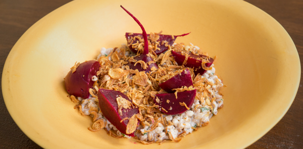 REHEAT the farro and fold in the brown butter sauce. Check for seasoning.