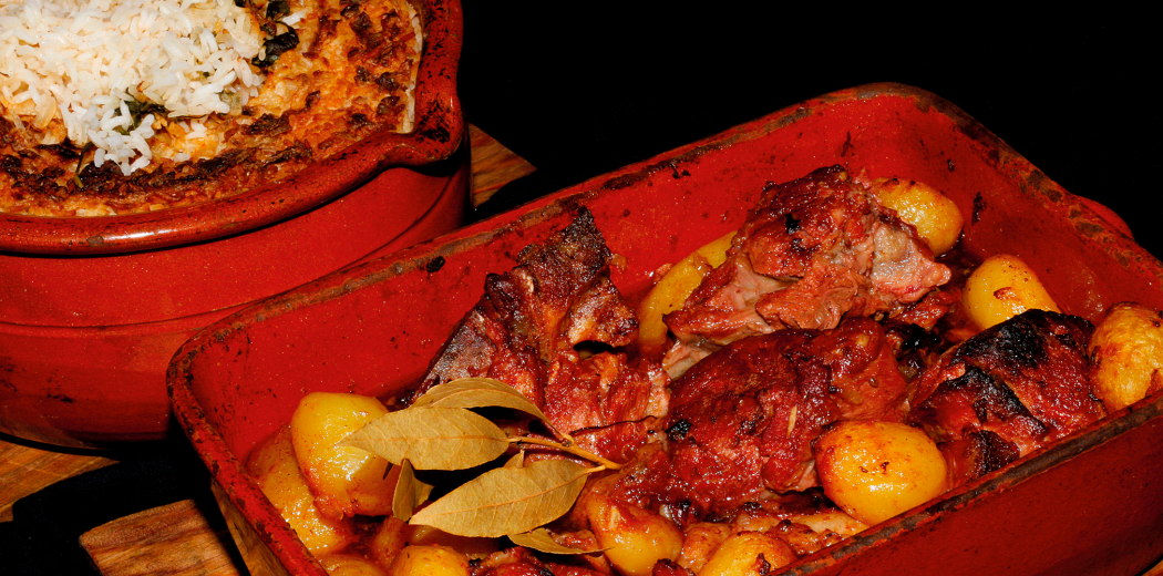 PLACE onions, butter, bay leaves, wine and garlic on a baking tray. Put in the oven on the lower rack underneath where you will be placing the meat. This will serve to catch any excess fat that will drip as the meat is roasting.