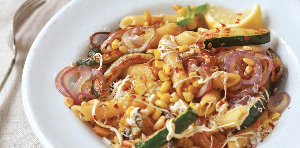 TURN OFF the heat and add half of the basil, the pine nuts, and the mozzarella. Add the lemon juice to taste and stir well to incorporate it. Scoop the penne into individual shallow bowls, making sure to evenly distribute the zucchini and corn. Top with the remaining basil, a fresh shaving of parmesan, and a drizzle of your best extra-virgin olive oil. Serve with lemon wedges if you wish.