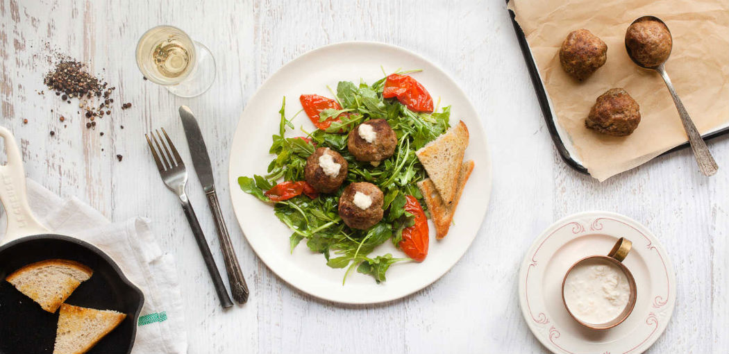 Divide arugula and tomato salad evenly between 2 plates. Place meatballs on top and dollop with horseradish crema. Serve with garlic toast alongside.