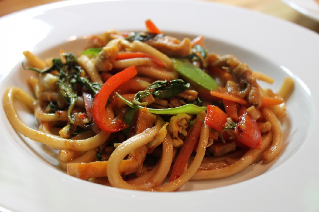 Sdd the bell peppers and carrots and cook for 2 minutes. Mix all the ingredients and pour the drained noodles over the top. Add the remaining sauce, thai basil, tomatoes, and green onions. Toss and stir fry another minute. Then remove from heat and serve warm with lime wedges.