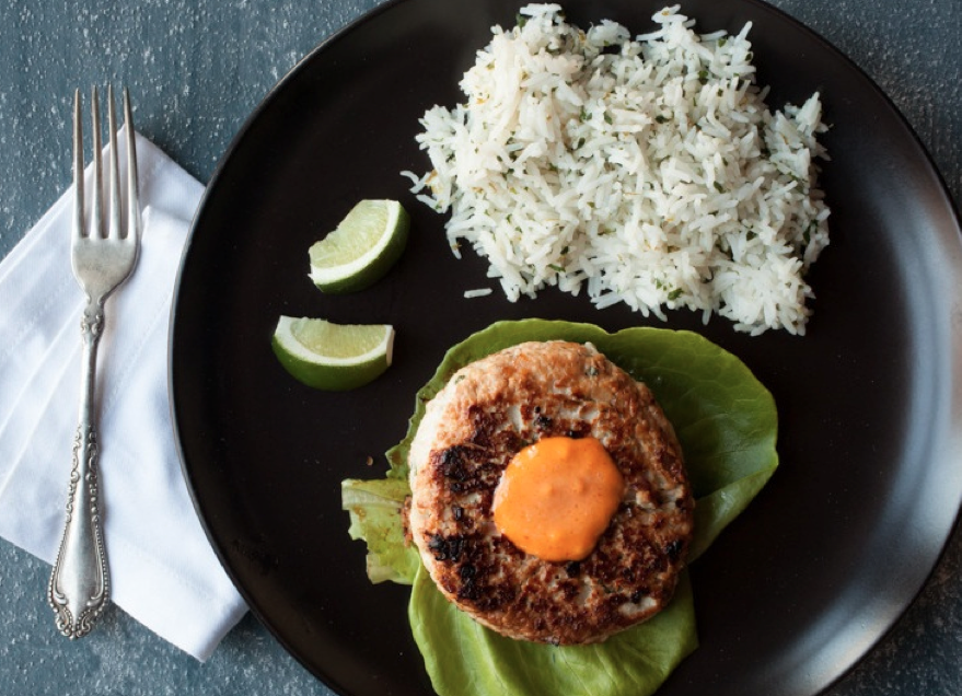 Add remaining cilantro, and juice and zest of remaining 1⁄2 lime to rice. Stir to combine. Taste and add salt and pepper as needed. Place each burger on 2 stacked lettuce leaves and top with Sriracha mayo. Serve rice alongside.