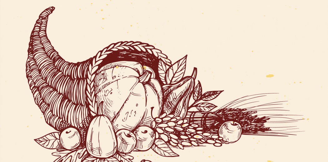In Greek mythology – and there are a few variations of this story – it is said that Zeus broke that horn off of an enchanted she-goat. Once the horn broke, the she-goat poured a never-ending supply of milk from the horn. Other tales say that whoever owns the horn has the power to fill it with whatever they want. Thus, the horn was established as a source of wealth and nourishment.