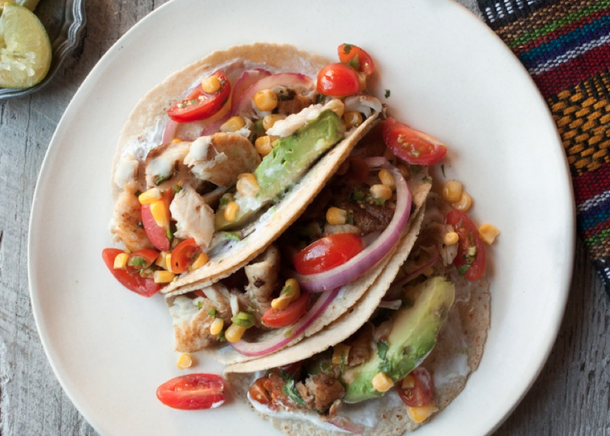 Halve avocado and discard pit. Using a spoon, carefully scoop out flesh and discard skin. Cut into 1⁄4-inch slices. Place 3 warmed tortillas on each plate. Add 1 spoonful yogurt sauce, a few slices avocado, and a few pickled onions to each tortilla. Top each with tilapia and tomato corn salsa. Serve.