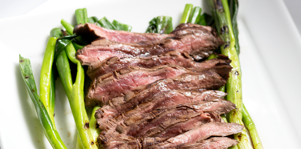 Thinly slice steak on the bias against the grain and plate on top of grilled scallions. Drizzle with reduced marinade.