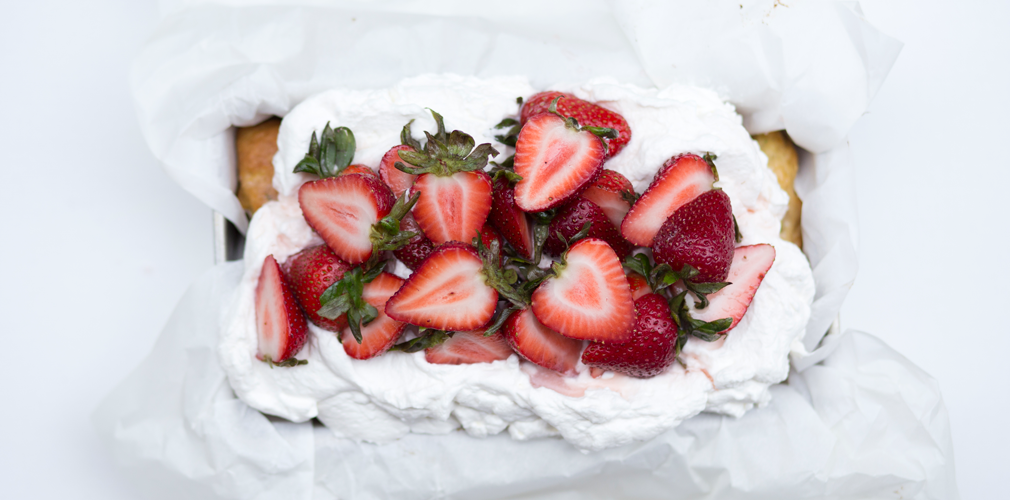 In a bowl place strawberries, sugar and 1/4 cup rose, allow the mixture to macerate for at least 30 minutes. In a large bowl whisk cream and 1 tablespoon rose to soft peaks. Top cake with whipped cream and strawberries.